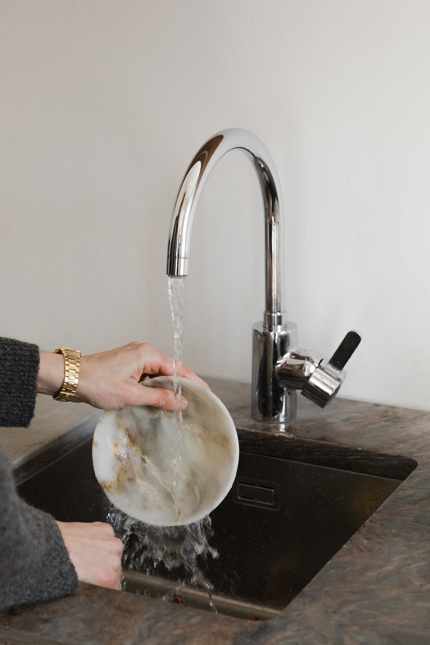 Natural stone is modest. And that's exactly how it wants to be treated. There is no need for special cleaning agents or complex knowledge of what to do. We tried it: Stonemade is stackable and dishwasher safe. We still prefer to clean it by hand and simply use clear, warm water. Every now and then it's good to rub the dishes with a few drops of olive oil, which gives them a velvety surface. Stonemade is probably the only tableware that becomes even more beautiful over time.